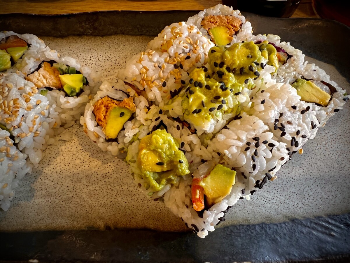 Mittags beginnen für uns heute Entspannung, Sonne und Kulinarik. Los geht’s im ‚Cōté Sushi‘, das wir schon aus Metz kennen. Von der Qualität des Sushi und der Bowls waren wir im japanisch-peruanisch dekorierten Lokal hin und weg, so auch heute. Hier bestellt man per Handy, muss aber alle seine Daten angeben. Micky Mouse ist unser Pseudonym, und es klappt!