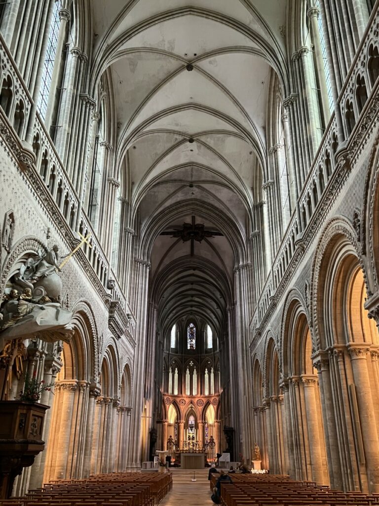 Schon 2015 waren wir hier in Bayeux und es ist noch genauso schön. 13.000 Einwohner im Départment Calvados (den es hier auch überall zu trinken und zu kaufen gibt). Der städtische Stellplatz liegt 20 Fußminuten vom historischen Stadtkern mit Kathedrale entfernt. Heute haben wir den dritten Tag in Folge Regenwetter, immer mal wieder für 3–4 Stunden von trockeneren Phasen unterbrochen. Ein Wettlauf der Wetter-Apps beginnt: welche Prognose ist zuverlässiger? OK – unentschieden.