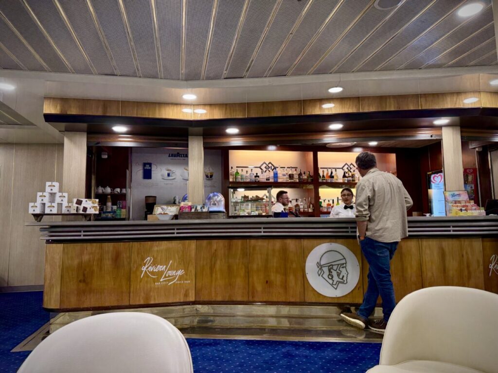 Nach dem Einzug in die Kabine Spritz in der Bar trinken und das bunt gemischte Völkchen beobachten, von Backpackern über Klein- und Großfamilien, Menschen mit Pudeln, Dackeln und Dobermännern ist alles dabei. Moritz macht es wieder ganz souverän, geht ohne Bellen an allen vorbei, schnarcht neben uns auf gemütlichem Teppichboden an der Bar und später auf seiner Decke in der Kabine.